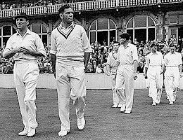 SURREY GREATS - ALEC BEDSER Sir Alec Victor Bedser was the leading English bowler of the early post-war years and an automatic choice for his country until 1954/55. Along with his twin brother Eric, he joined the Surrey staff in 1938 only to have his early career interrupted by the Second World War. When it resumed in 1946 he walked straight into the England side and began a distinguished international career by taking eleven wickets in each of his first two Tests. Over the next decade he was to collect a total of 236 wickets from 51 appearances (surpassing Clarrie Grimett's, then, all-time record of 216). For Surrey, he captured an additional 1,459 throughout their glorious run in the county championship and up until 1960, when he decided to call it a day. Tall and powerfully built, he was a model bowler with an action that was a marvel of economy. He took a relatively short run-up, but from the swing of his massive body he extracted maximum bounce from the pitch, whilst allowing himself to maintain accuracy at a fast-medium pace over long periods. Bedser's main delivery was the in-swinger with which he had many of his great opponents, Bradman included, caught at backward short leg. He also possessed a slightly slower leg-cutter which, on a wet pitch, was like being bowled a fast leg-break.