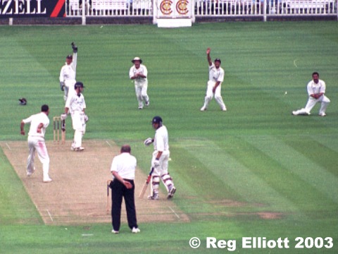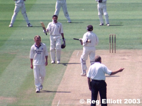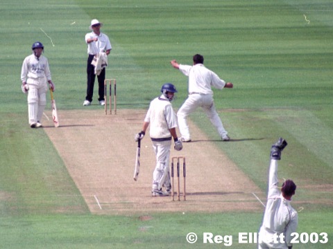 Ed Joyce is lbw to Martin Bicknell for 0. Middlesex first