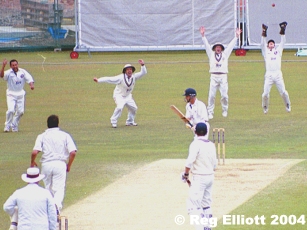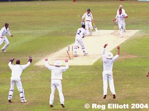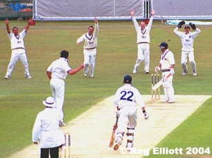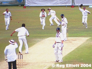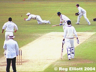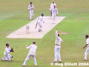 Jon Lewis is put down at slip by Alistair Brown off Adam